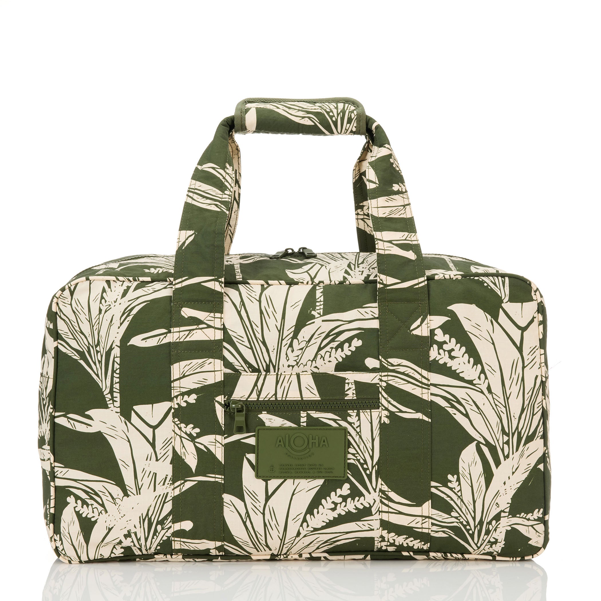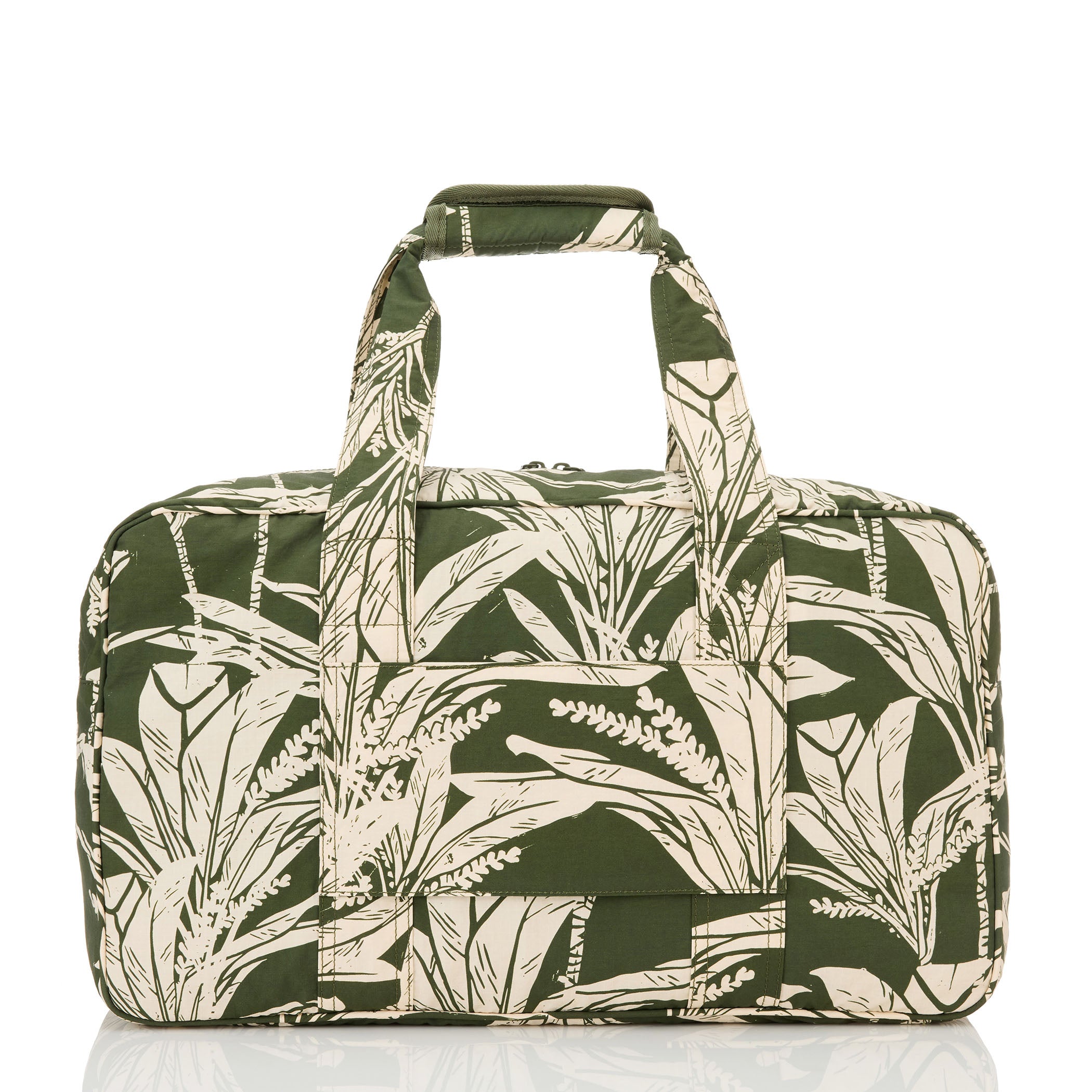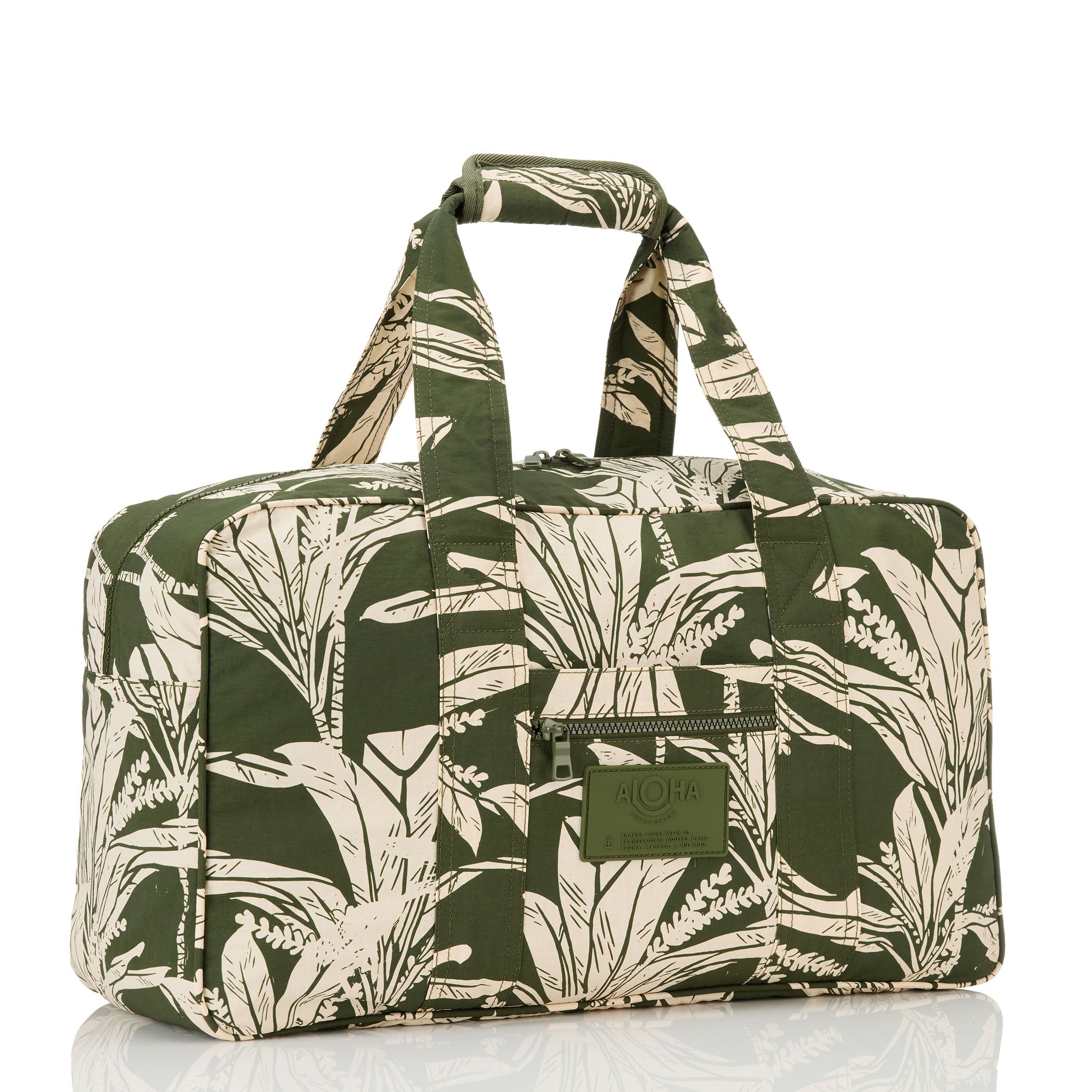 This print features bold, overlapping ti leaves evoking a sense of tropical warmth amidst autumn chill.