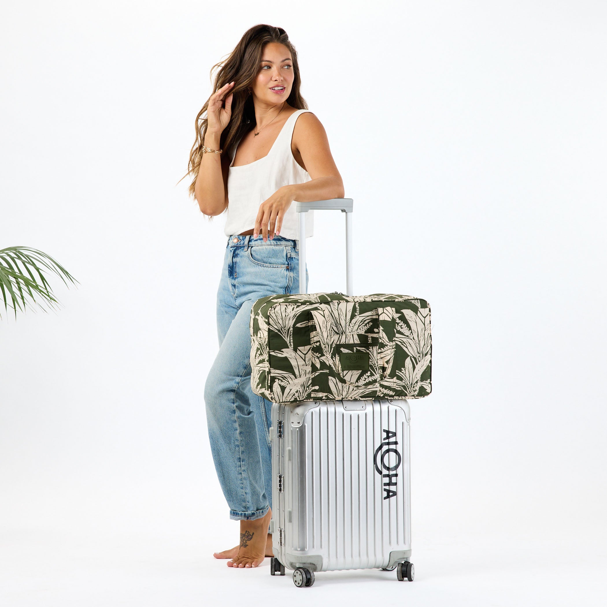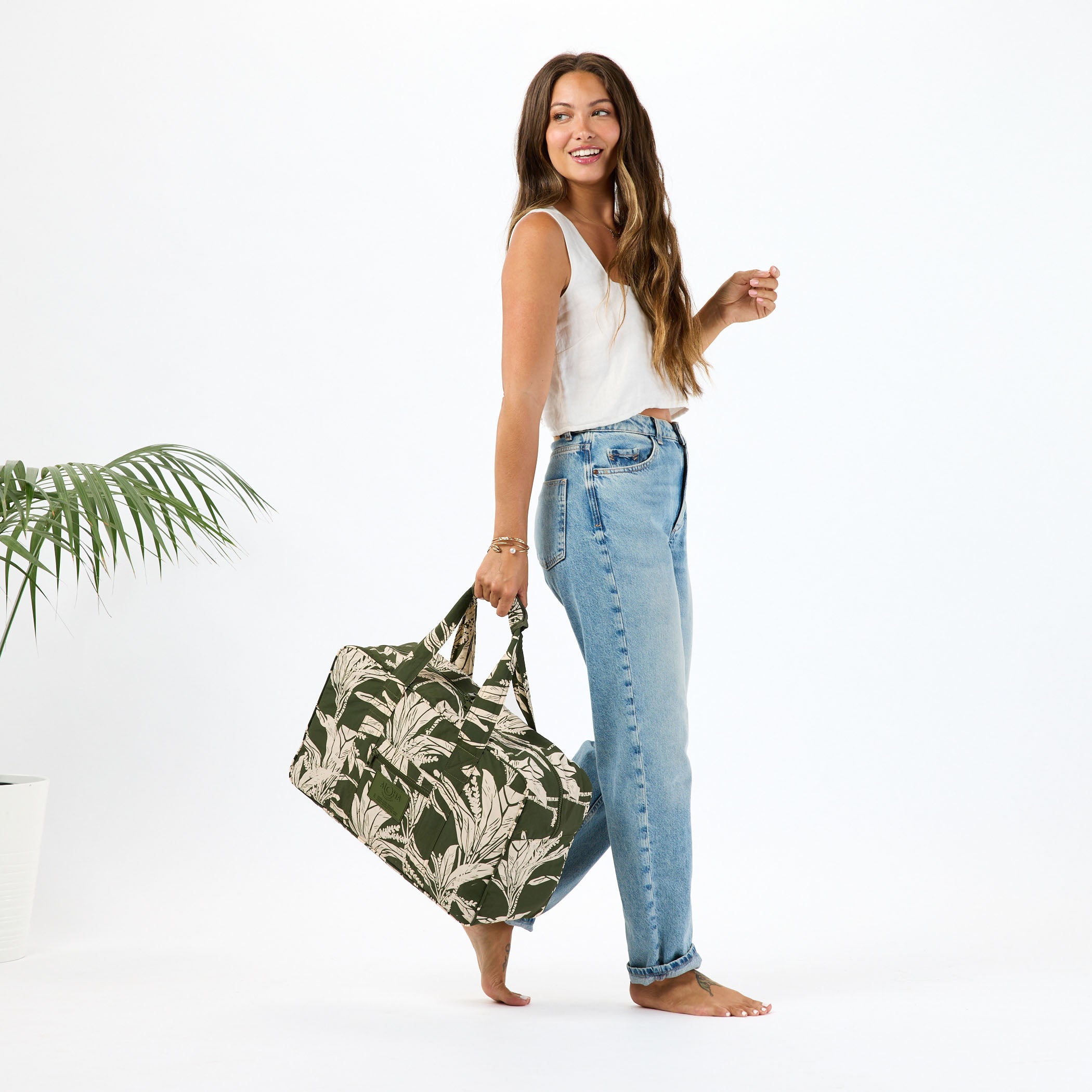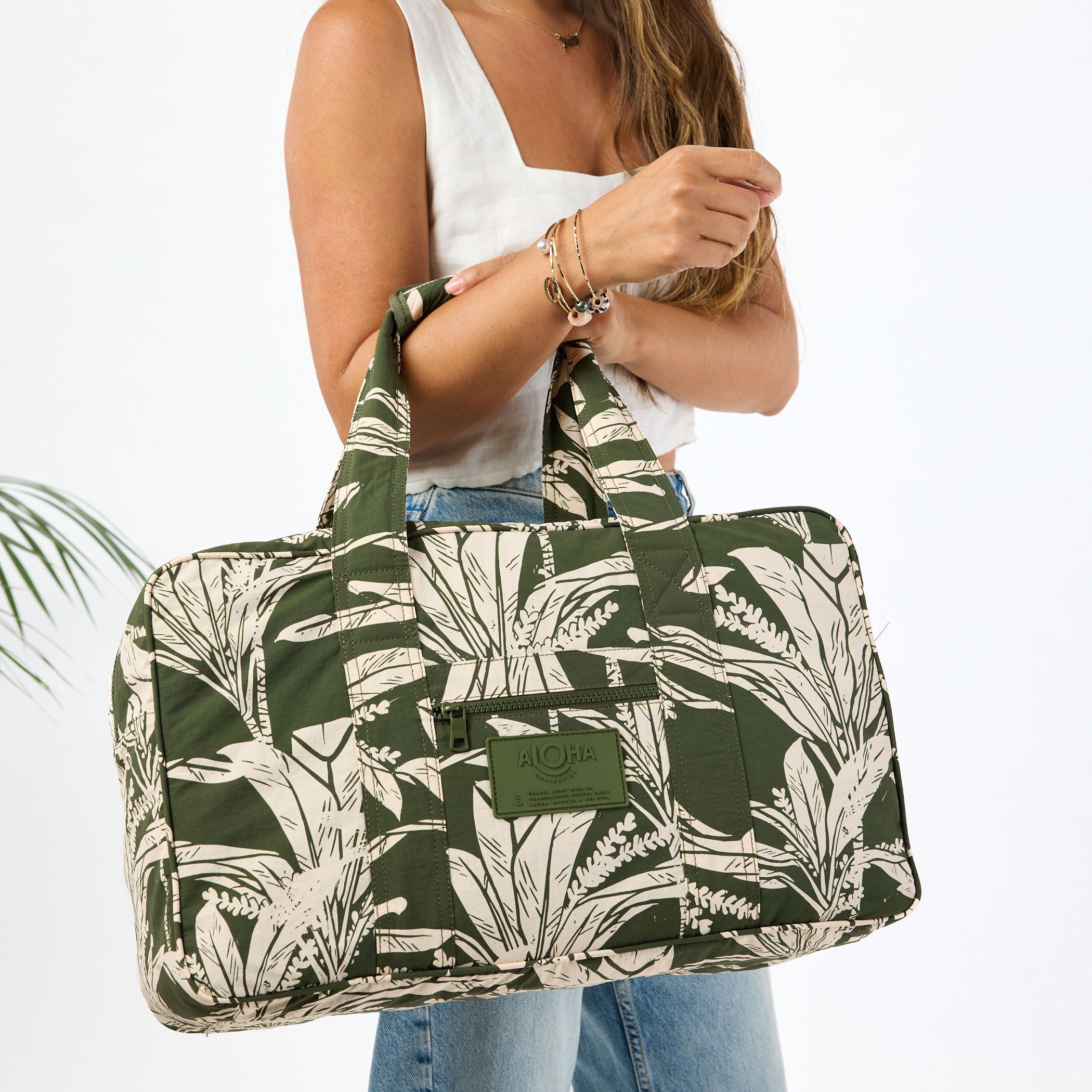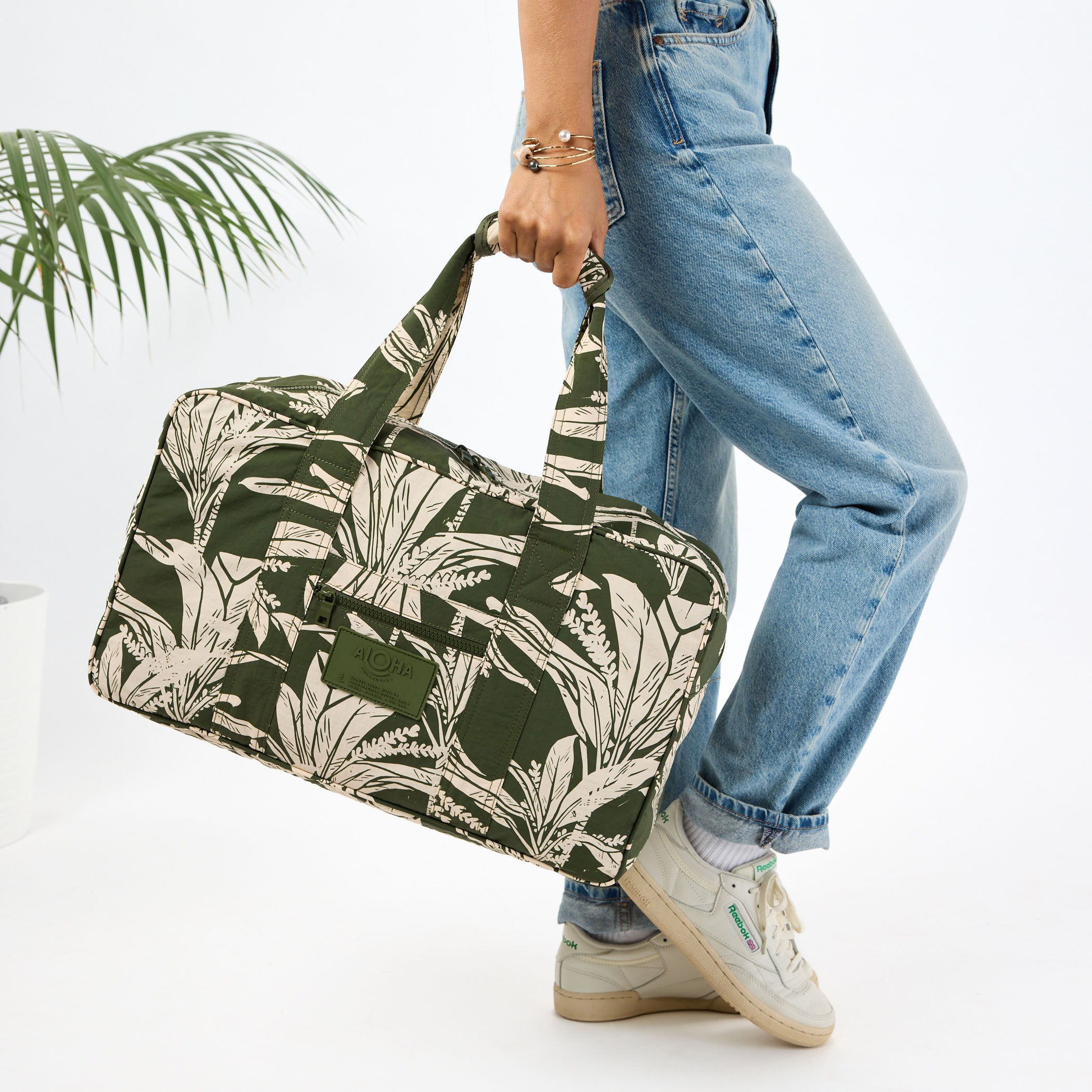 This print features bold, overlapping ti leaves evoking a sense of tropical warmth amidst autumn chill.
